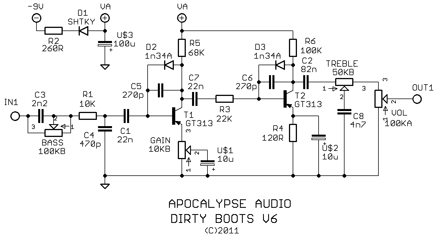 so i finally got my buddy's dirty boots finished. it's going to be used on guitar and organ, so i added a couple extra controls. a pre-bass and post-treble tone control combo work great together. this is the main recipe for filtering distortion pedals, so it's no surprise. i plan on doing a full overhaul of this design in the future, to see if i can optimize it any further, but until then, this one sounds great. here's the schematic i ended up with.